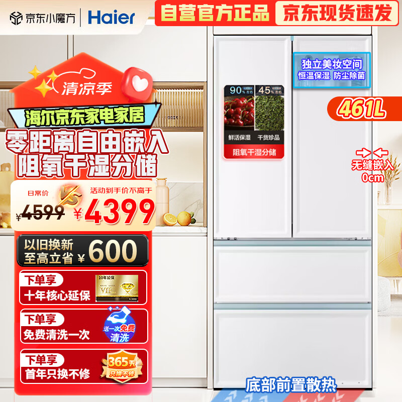 海尔(Haier)零嵌入式冰箱461升零距离法式多门双开门四开门一级能效双变频超薄风冷无霜底部散热家用电冰箱价格:4519.00元!
