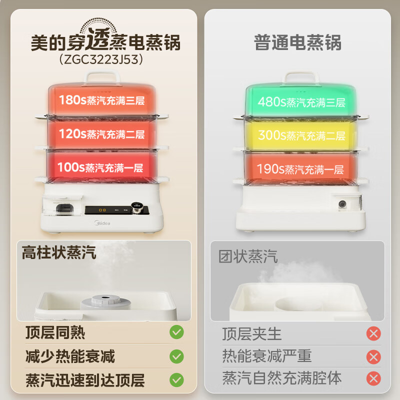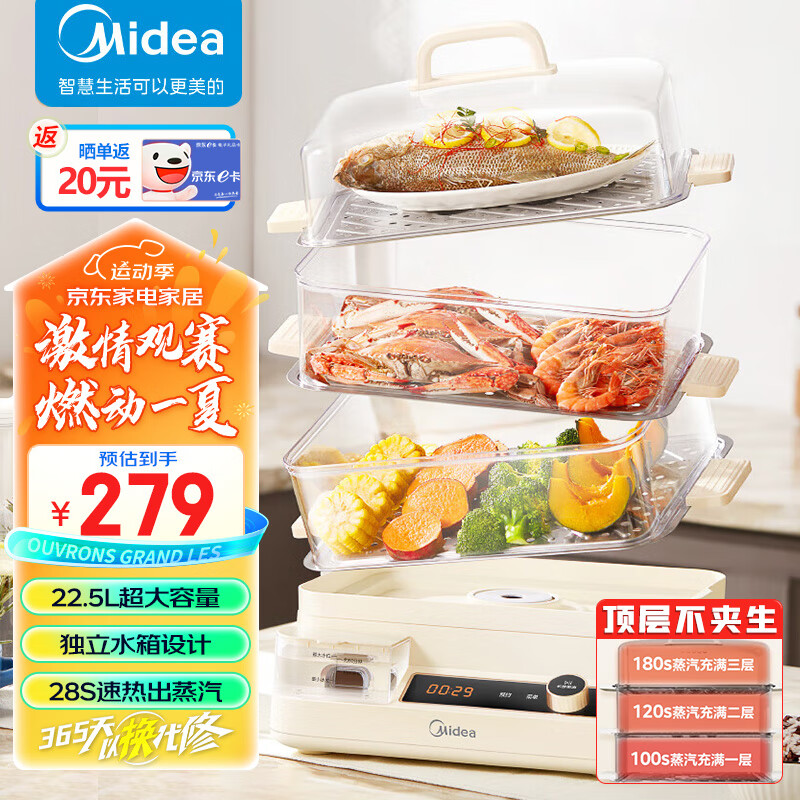 美的(Midea)穿透蒸电蒸锅 22.5L三层大容量多功能锅 活水鲜蒸外置加水家用蒸锅多用途锅全透视窗MZ-ZGC3223J53价格:279.00元!