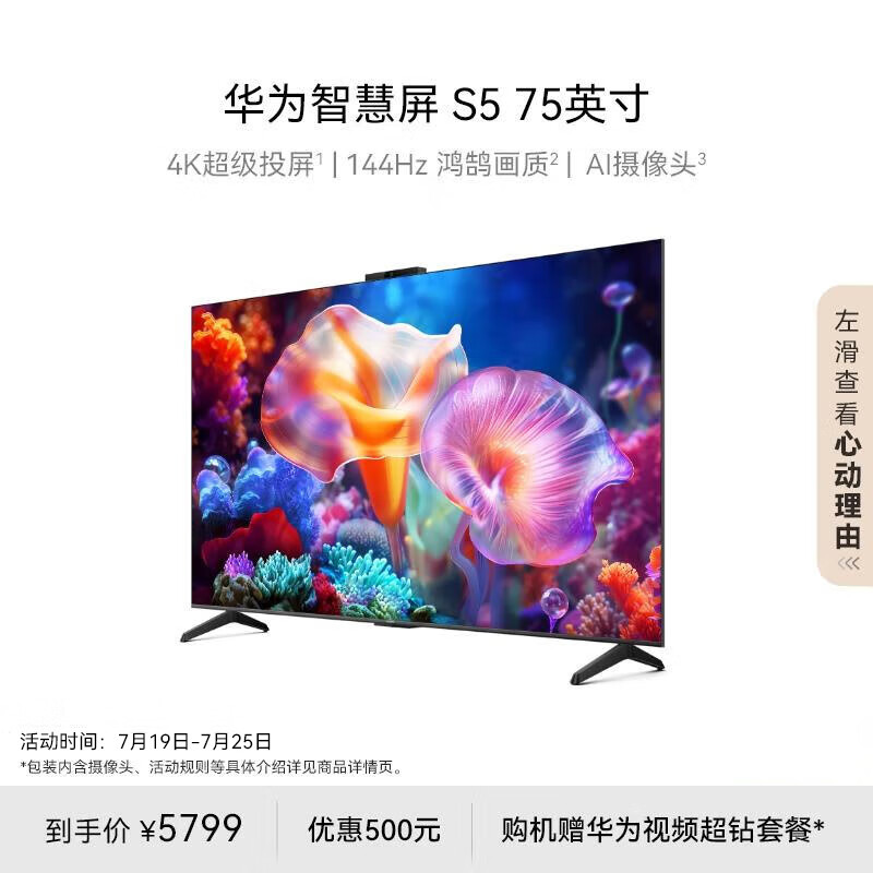 华为智慧屏 S5 75英寸 4K超级投屏 144Hz鸿鹄画质高清超薄智能液晶游戏电视机HDB5276H价格:5799.00元!