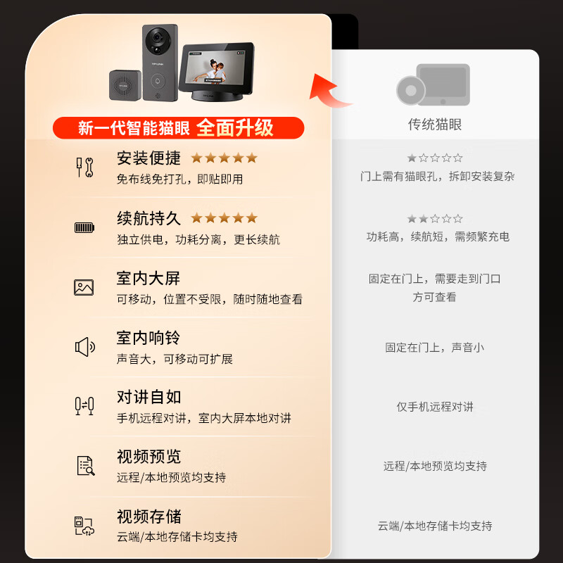 TP-link 可视门铃带显示屏智能电子猫眼摄像头家用 400万高清防盗门口监控无线wifi手机远程对讲视频通话价格:489.00元!