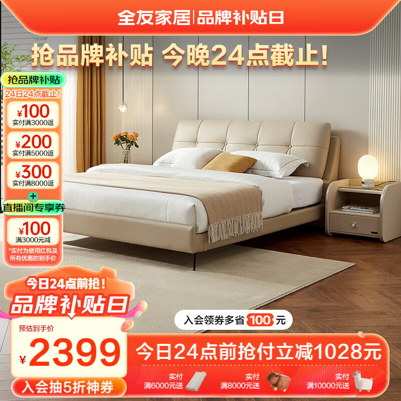 全友家居 真皮艺双人床1.8x2米现代简约主卧室头层牛皮软包大床105135价格:3427.14元!