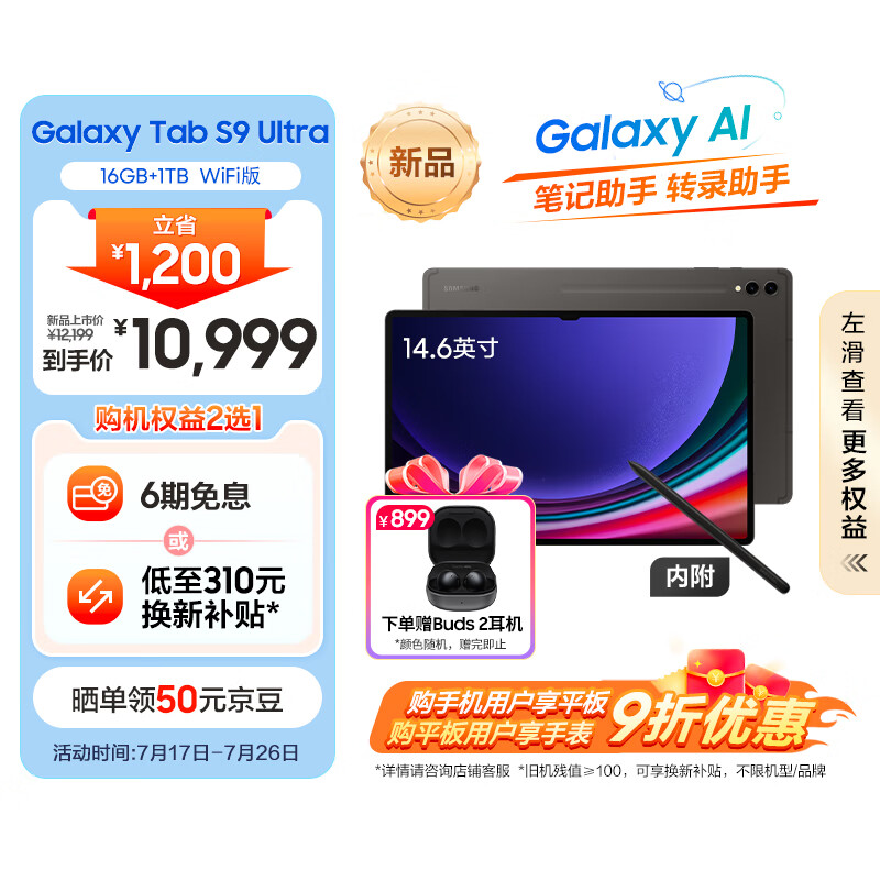 三星(SAMSUNG)S9 Ultra Al智享学习办公平板电脑14.6英寸 120Hz 16G+1TB WIFI版 AI平板 云影灰价格:10999.00元!