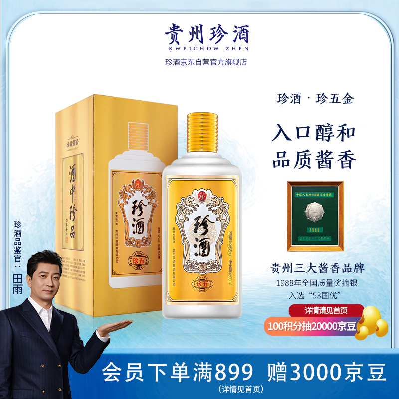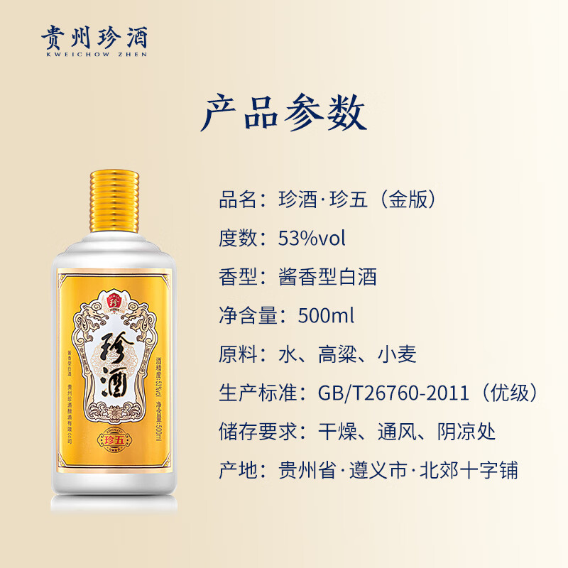 珍酒珍五金装版 53度 酱香型白酒 500ml 单瓶装 纯粮酿造大曲坤沙价格:180.00元!