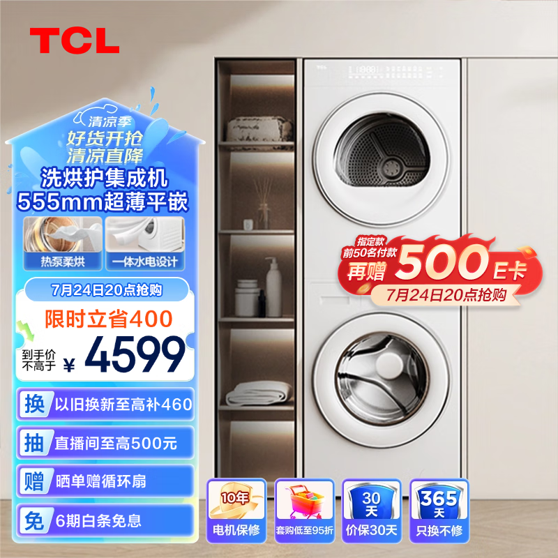 TCL 双子舱洗烘护集成机T10 一体式洗烘套装 除菌净螨 10公斤滚筒洗衣机+10公斤热泵烘干GH200T10-W价格:4599.00元!
