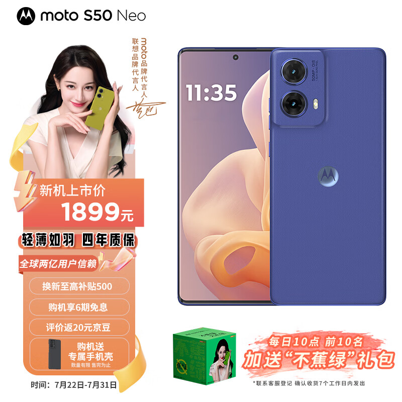摩托罗拉 联想moto S50 Neo 四年质保 高级时尚 应用六开 5000mAh超薄长续航 5GAI手机 12+512GB 兰亭价格:1899.00元!