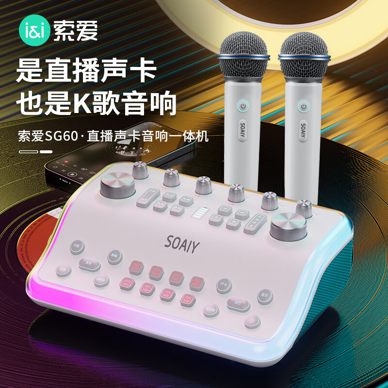索爱(soaiy)SG60声卡音响一体机k歌专用直播麦克风录音设备全套无线电容麦手机电脑话筒套装户外 双麦白价格:529.00元!