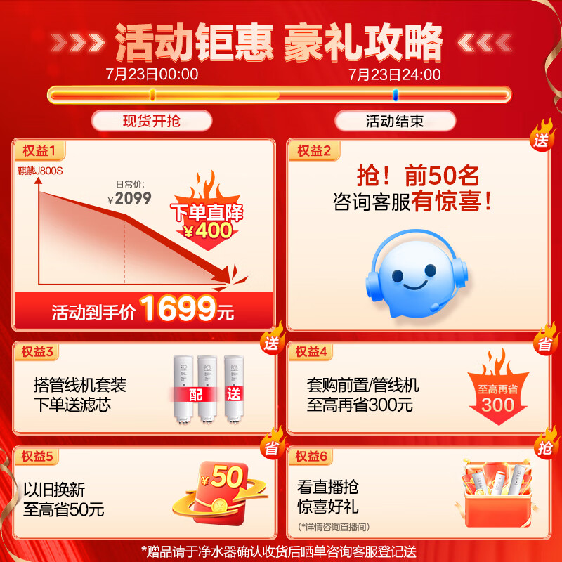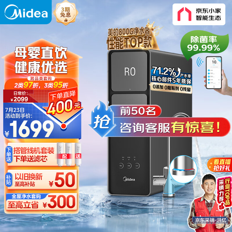 美的(Midea)麒麟J800S家用净水器 RO反渗透除菌母婴直饮 厨下式净水机 双出水一级水效 800G大通量 2L/分价格:1699.00元!