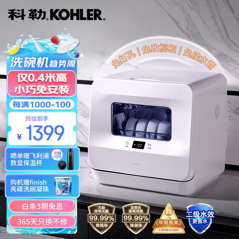 科勒(KOHLER)免安装台式洗碗机 家用独立式小型台上刷碗机 台面全自动洗碗机 UV紫外线消毒一体机29974T-NA价格:1399.00元!