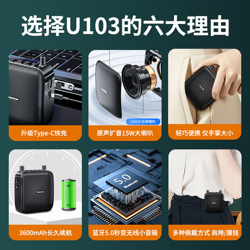 纽曼(Newmine)U-103小蜜蜂扩音器教师专用麦克风喇叭导游腰挂蓝牙音箱迷你便携式教学讲课喊话器大音量价格:199.00元!