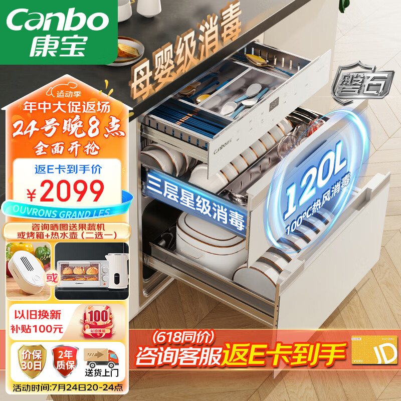 康宝(Canbo)120L磐石PRO三层不锈钢消毒柜 嵌入式家用 大升数高温餐具母婴奶瓶二星热风消毒碗柜XDZ120-V6白色价格:2199.00元!