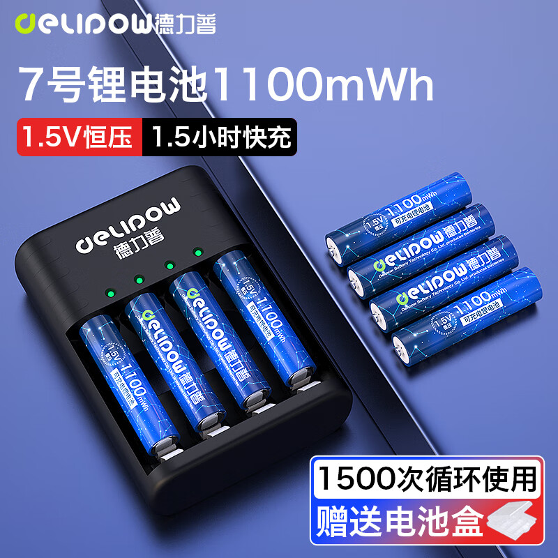 德力普(Delipow)充电电池 7号锂电池1100mWh大容量8节装1.5V恒压配4槽智能快充充电器适用玩具/电动牙刷等价格:175.80元!