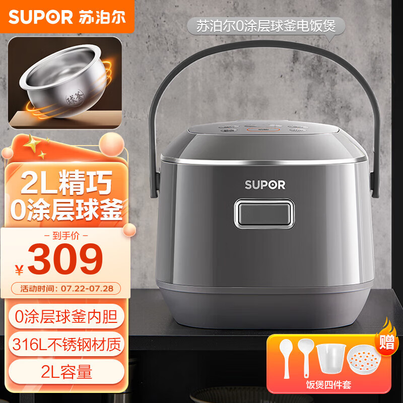 苏泊尔(SUPOR)迷你小容量家用电饭煲 2L小升数 不锈钢球釜内胆1-2-3个人多功能0涂层电饭锅智能预约 SF20FC615A 2L价格:309.00元!