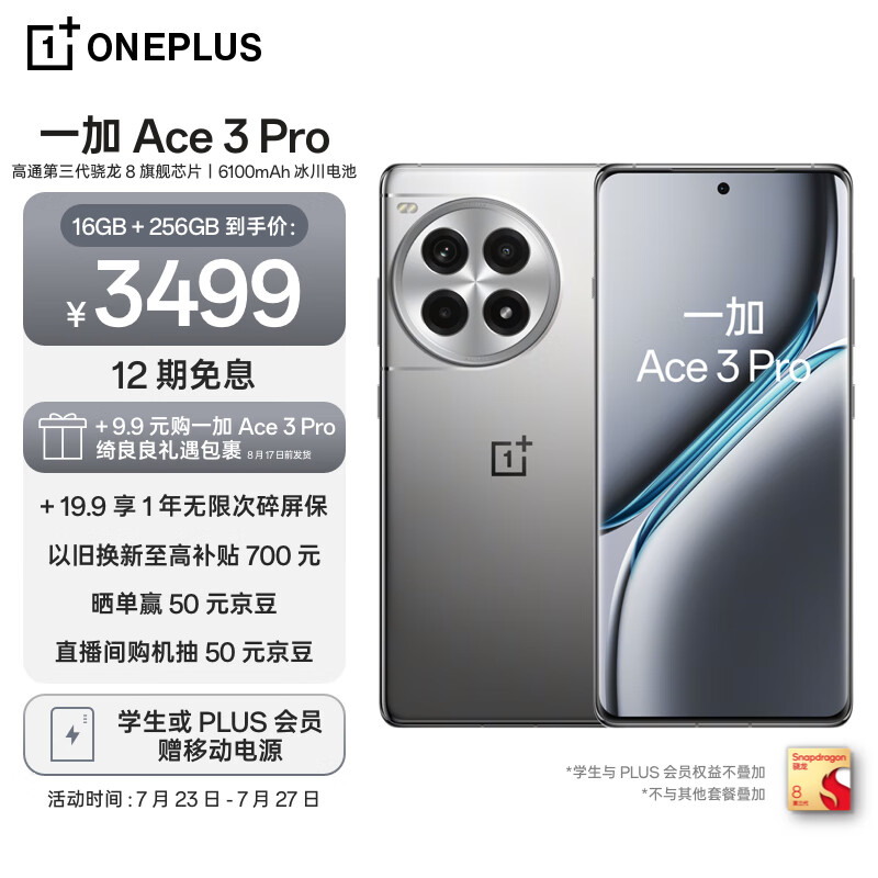 一加 Ace 3 Pro 16GB+256GB 钛空镜银 第三代骁龙 8 旗舰芯片 6100mAh 冰川电池 AI智能游戏手机价格:3499.00元!