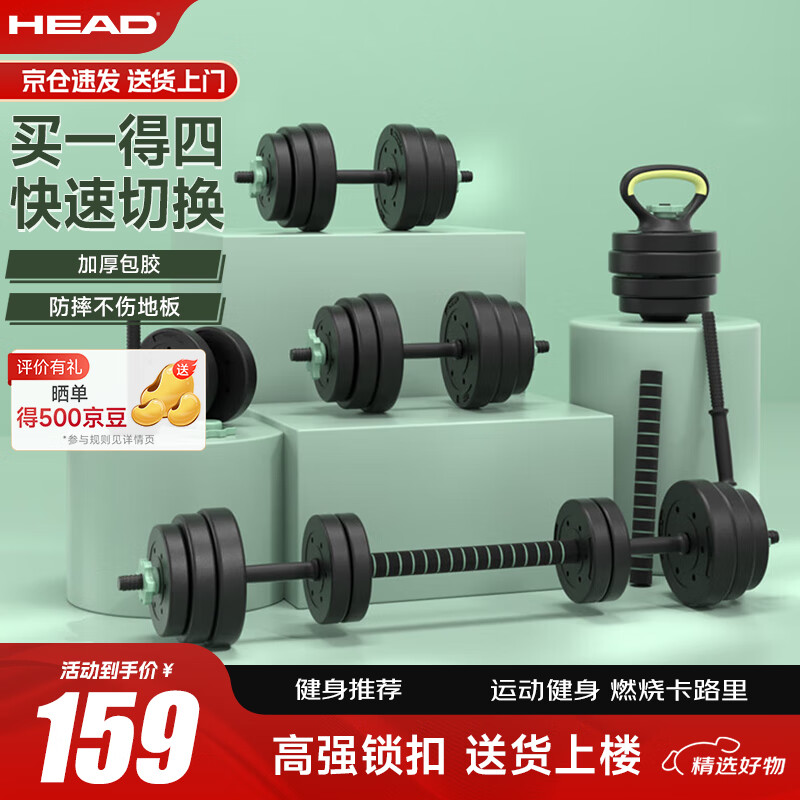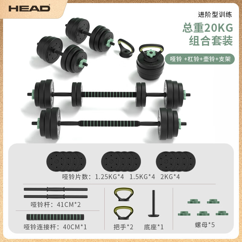 HEAD海德哑铃杠铃壶铃家用健身器材男女通用组合套装20kg价格:159.00元!