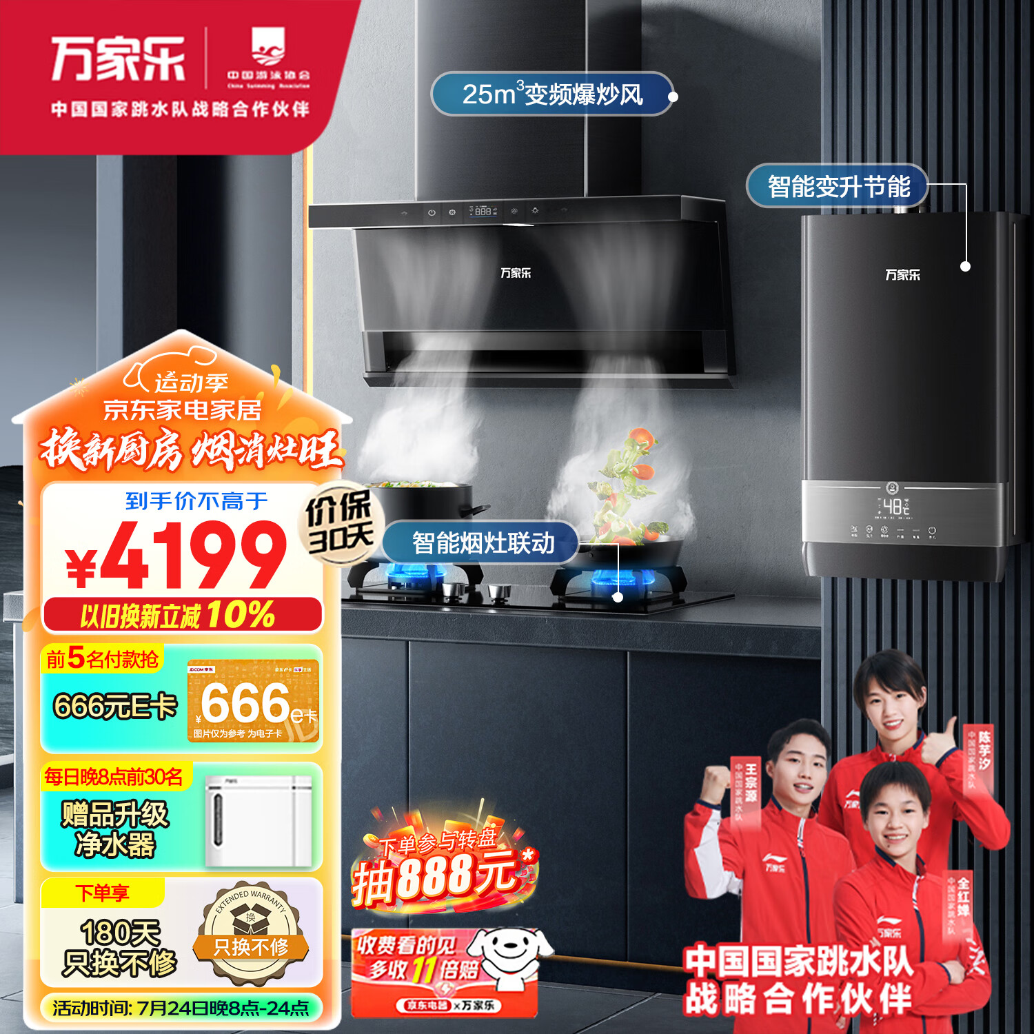 万家乐 抽油烟机 25m3/min顶侧三腔变频巡航烟灶联动13L零冷水烟灶热三件套装TAK8+KV063B+13DL1天然气价格:4299.00元!
