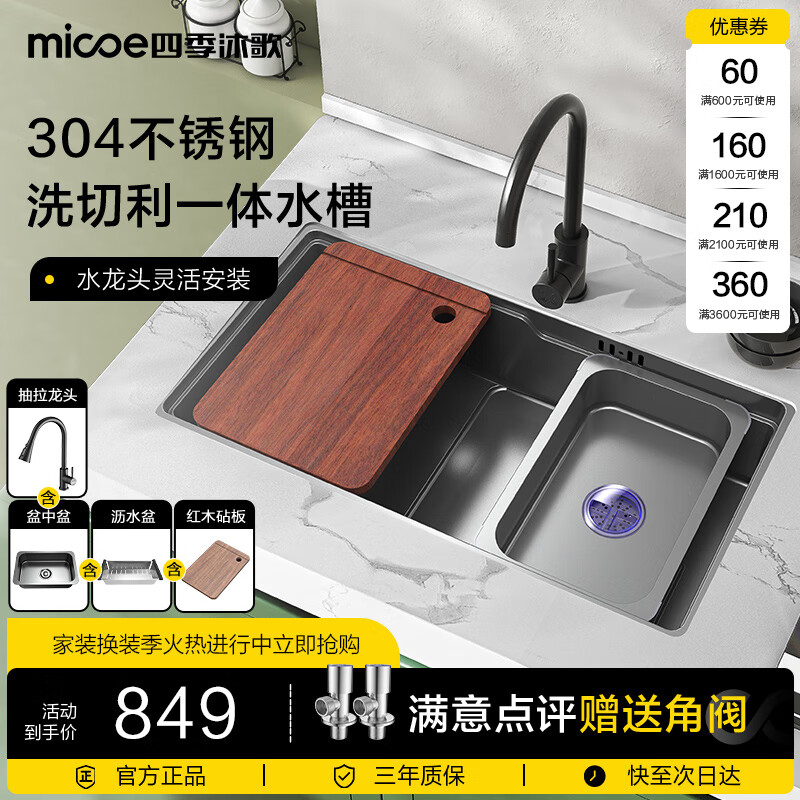 四季沐歌(MICOE)厨房水槽单槽纳米304不锈钢洗菜盆台下盆多功能阶梯式龙头大容量价格:1299.00元!