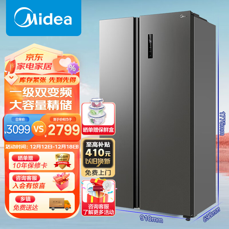 美的(Midea)607升双变频一级能效对开双开门家用超薄电冰箱智能净味无霜BCD-607WKPZM(E)大容量606升级款价格:3099.00元!