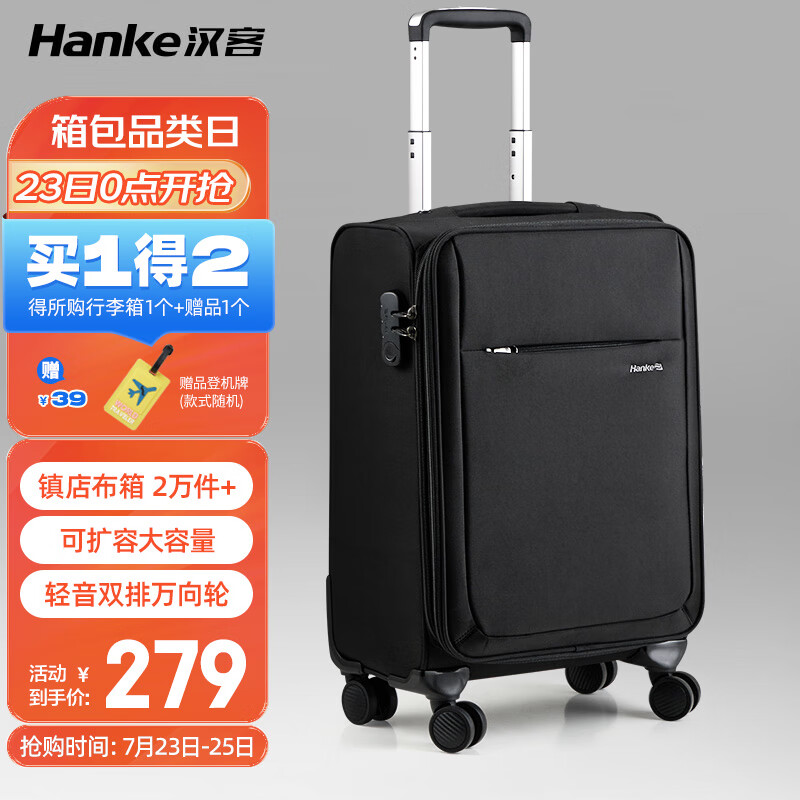 汉客万向轮行李箱旅行箱男女拉杆箱小箱子登机箱密码箱包黑色20英寸价格:279.00元!
