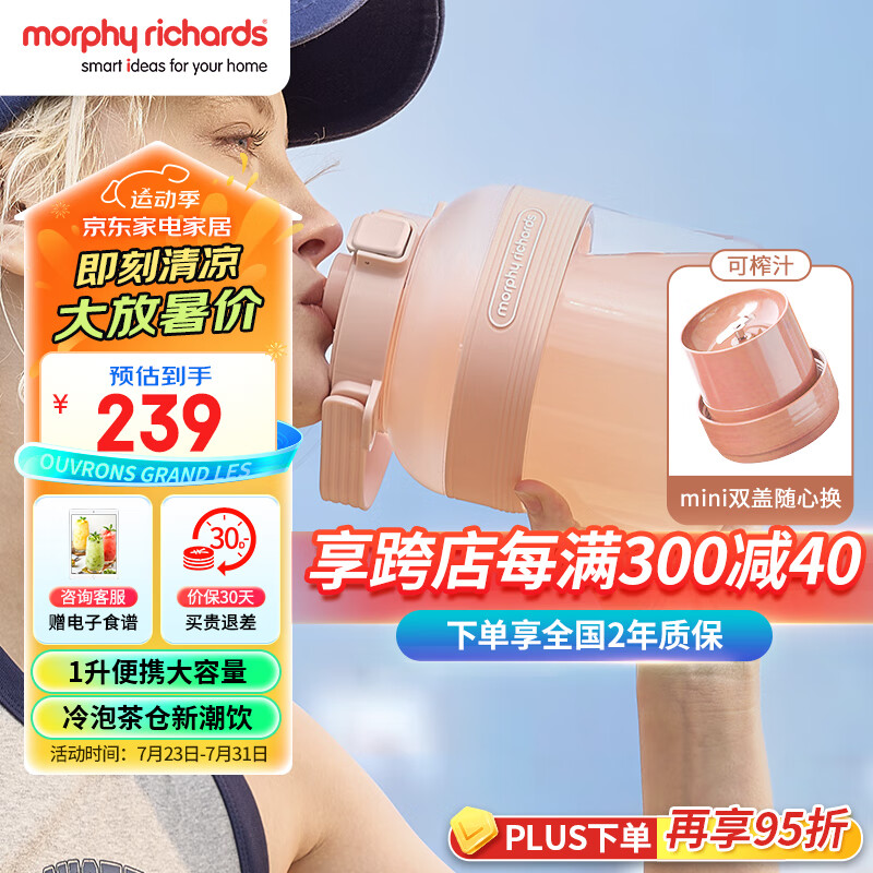 摩飞电器(Morphyrichards)榨汁机 榨汁桶便携榨汁杯无线充电果汁杯随行杯1升容量户外果茶冷泡桶迷你小胖吨MR9805 Nano版 粉价格:239.00元!