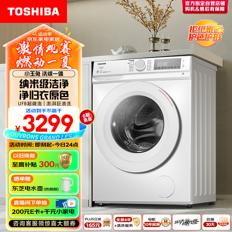 东芝(TOSHIBA)滚筒洗衣机全自动【小玉兔DD-107T13B】洗烘一体机 10公斤大容量 UFB超微泡 热平衡烘干 以旧换新价格:3299.00元!