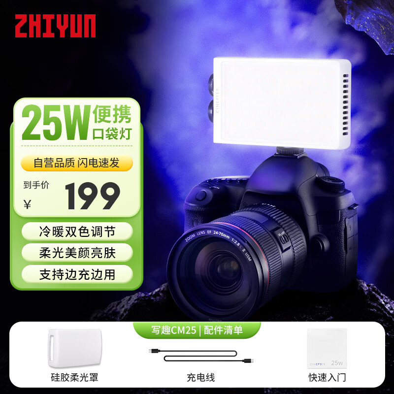 zhi yun智云 写趣CM25直播摄影灯 25W专业便携打光灯led手机相机用小型影视灯室内户外拍摄设备常亮口袋灯价格:199.00元!