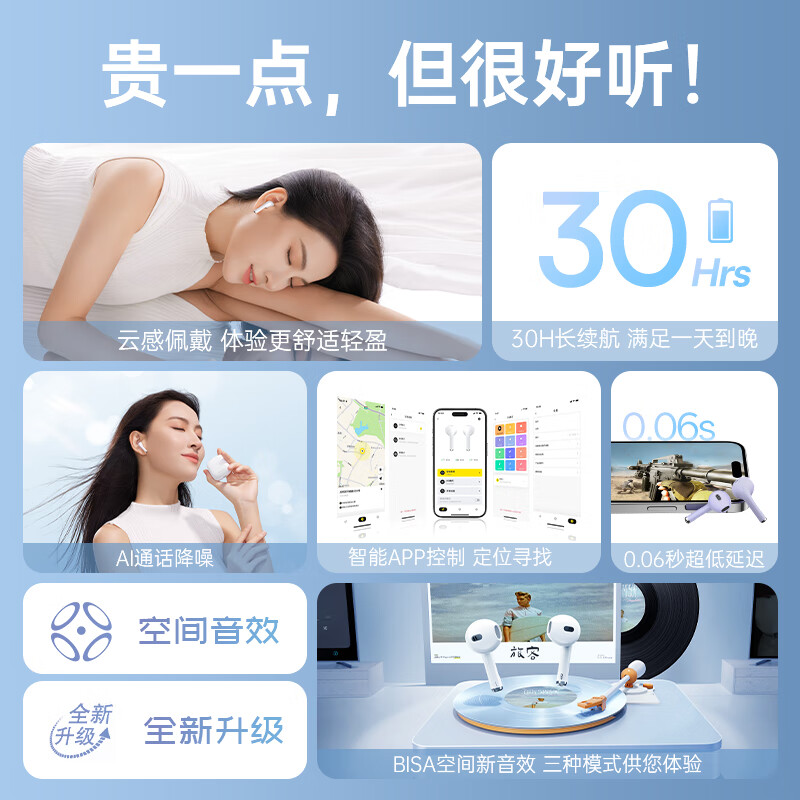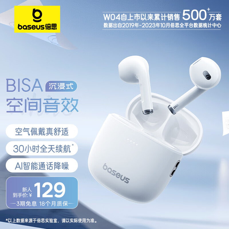 倍思 W04 真无线蓝牙耳机 半入耳通话降噪 低延迟长续航 适用于苹果华为小米oppo手机 白色价格:158.00元!