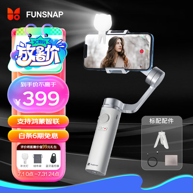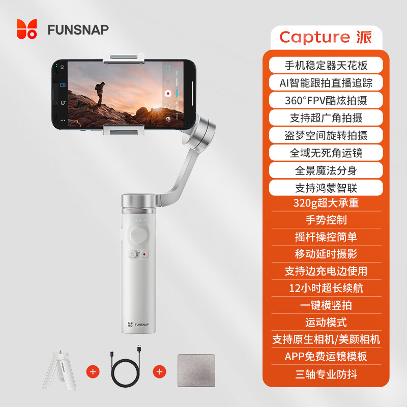 逗映(FUNSNAP)派 手机稳定器 手持云台稳定器 三轴防抖跟拍云台 全域无死角运镜 折叠收纳带三脚架价格:399.00元!