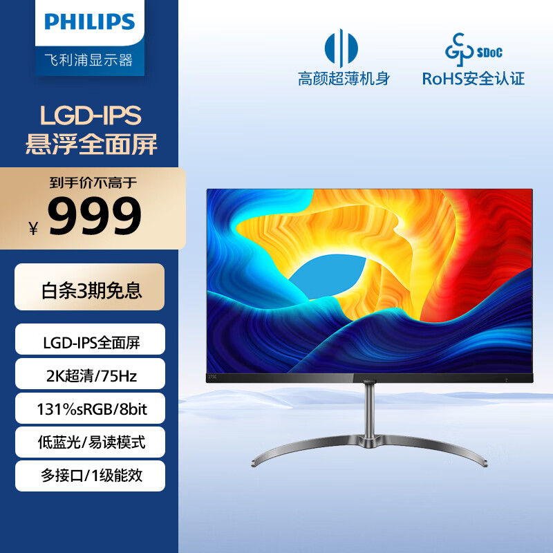 飞利浦 27英寸 LGD-IPS悬浮屏 2K超薄75Hz 131%sRGB广色域金属支架底座高清设计娱乐办公显示器275E9价格:999.00元!