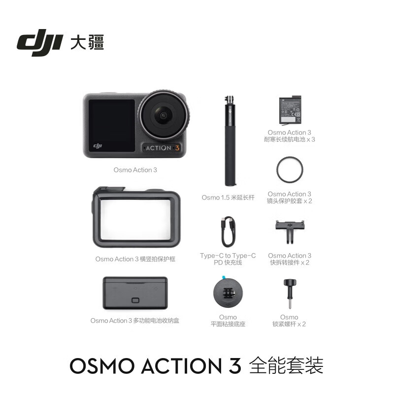 大疆 DJI Osmo Action 3 全能套装 运动相机 高清防抖手持vlog骑行摄像机+随心换1年版+128G内存卡价格:2202.90元!