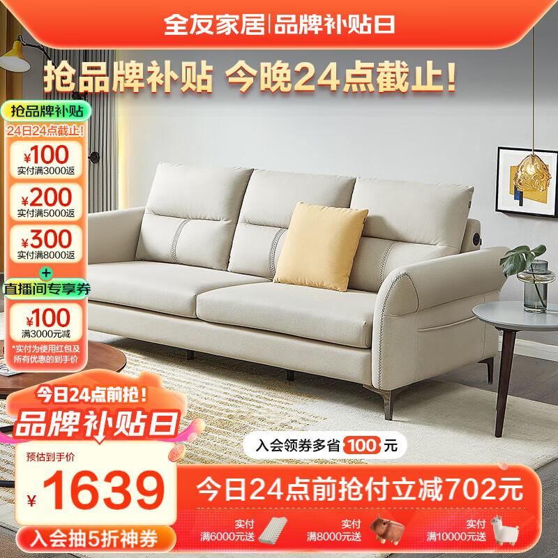 全友家居 现代简约功能科技布艺可拆洗储物三人位直排沙发客厅102679价格:2341.43元!