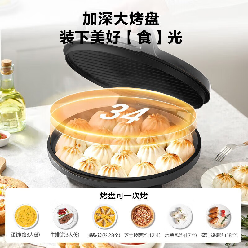 美的(Midea)电饼铛 家用双面加热电饼档煎饼锅 可做三明治 旋控式加深加大烤盘早餐机 蒸汽煎烤机 烙饼锅 【34大口径】JHN34Q(JK33P63XY)价格:199.00元!