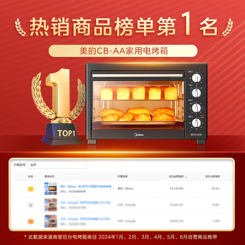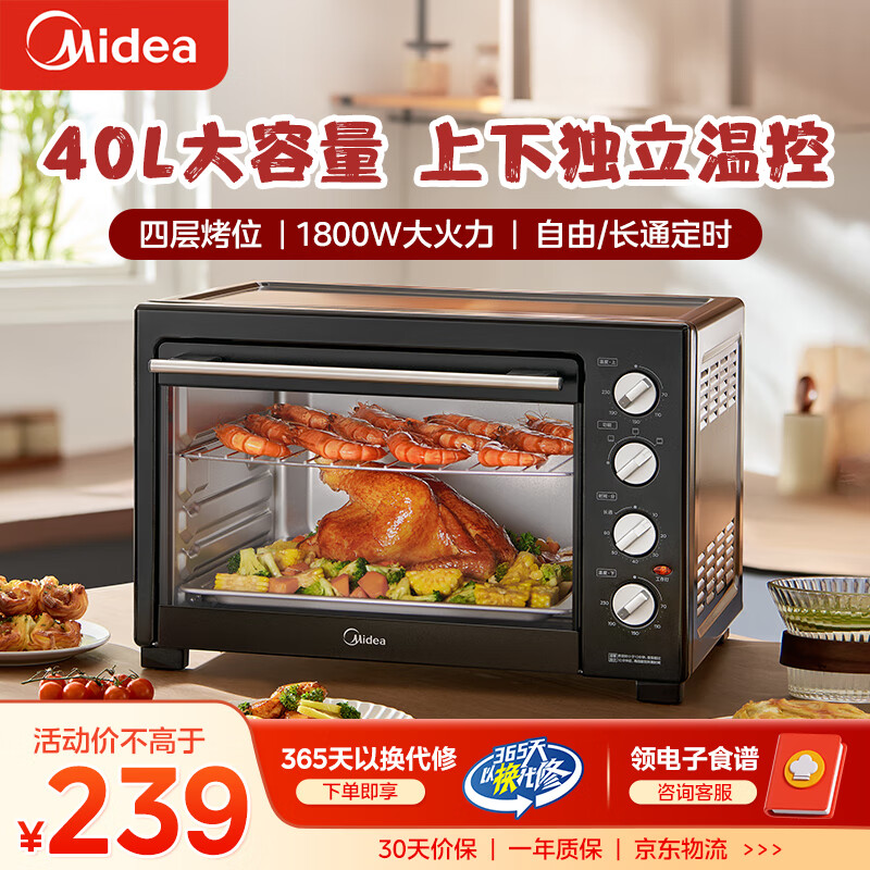 美的(Midea)40L家用大容量多功能电烤箱 独立控温/机械操控/四层烤位/多功能烘焙MG38CB-AA价格:239.00元!