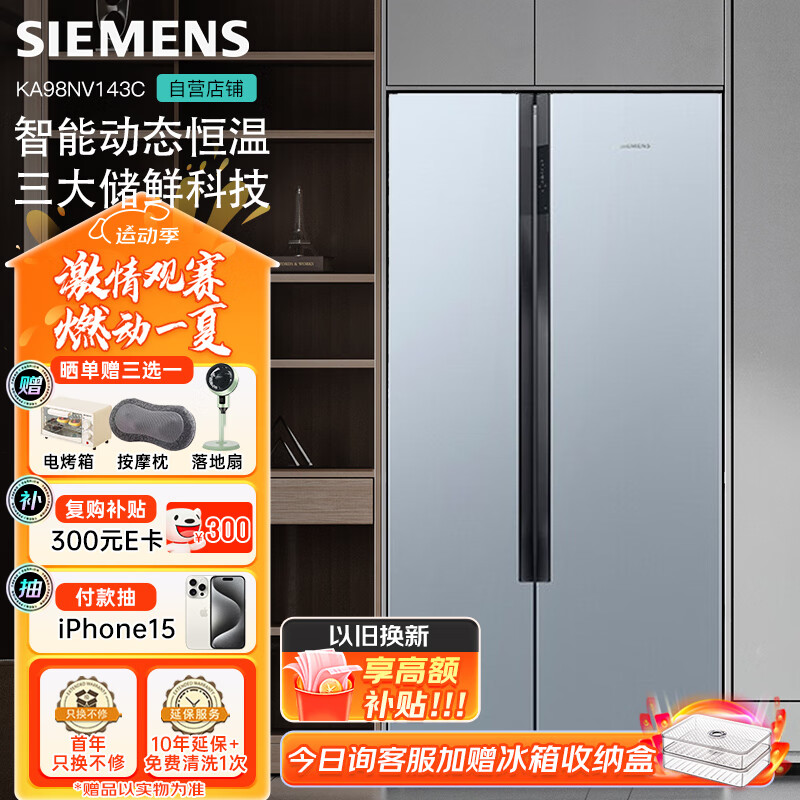 西门子冰箱对开门630升大容量动态恒温风冷无霜高效保湿独立双循环双控温家用变频智能冰箱KA98NV143C价格:7389.00元!