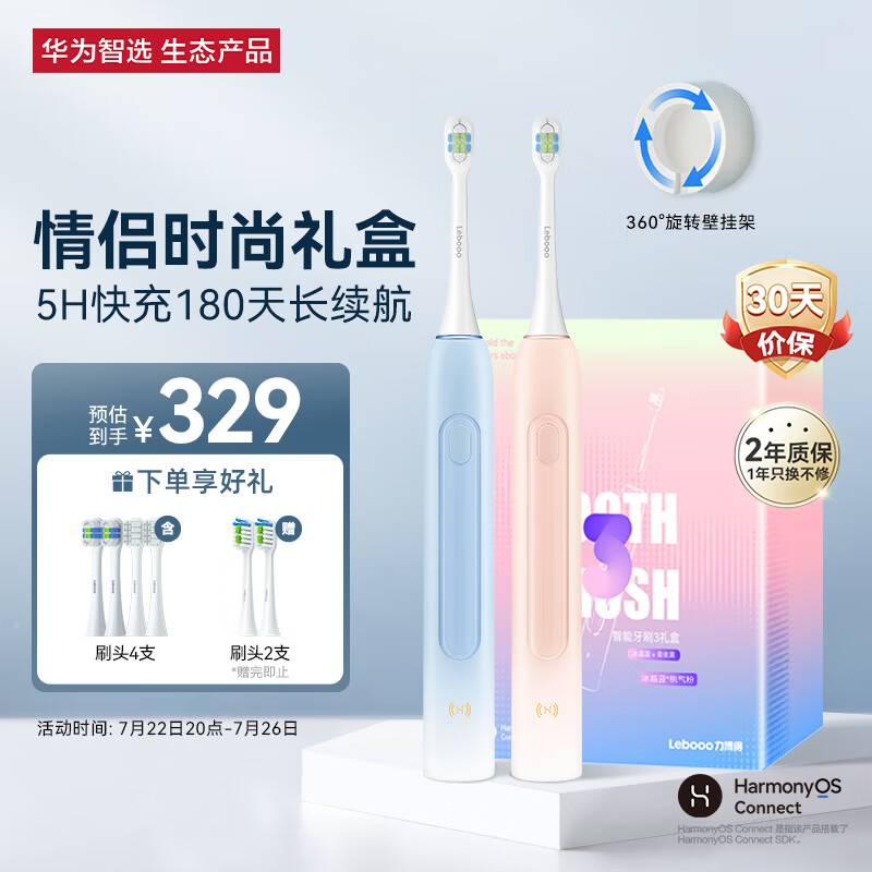 华为智选力博得电动牙刷 七夕情人节礼物 智能声波牙刷清洁亮白180天长续航优漾3 双支装(冰晶蓝+桃气粉)价格:369.00元!