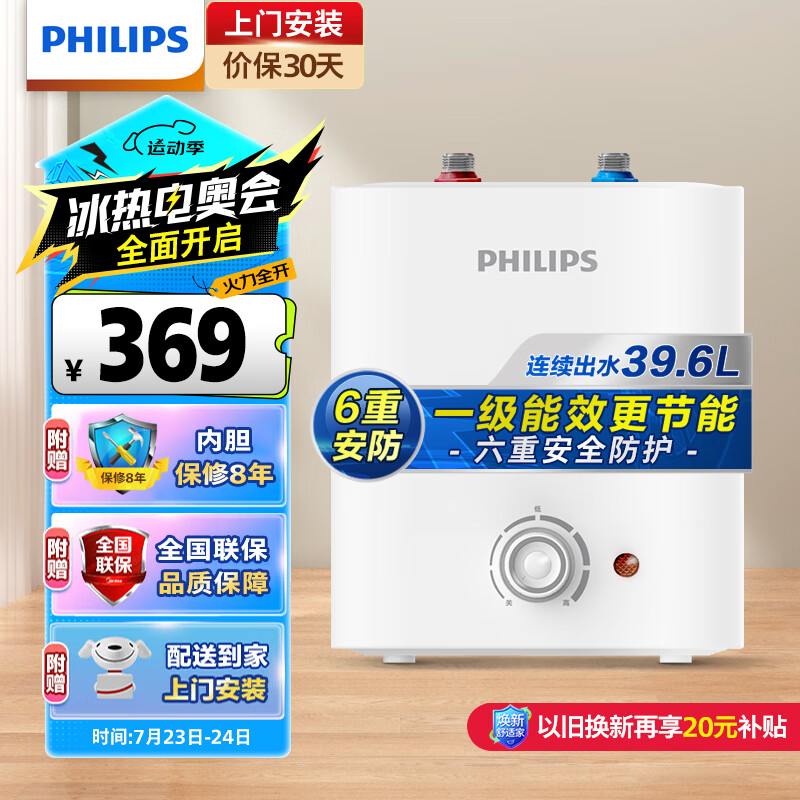 飞利浦(PHILIPS)一级能效6.6升上出水电热水器迷你小厨宝 小尺寸1600W速热 实时控温AWH1003/93(066UA)价格:399.00元!