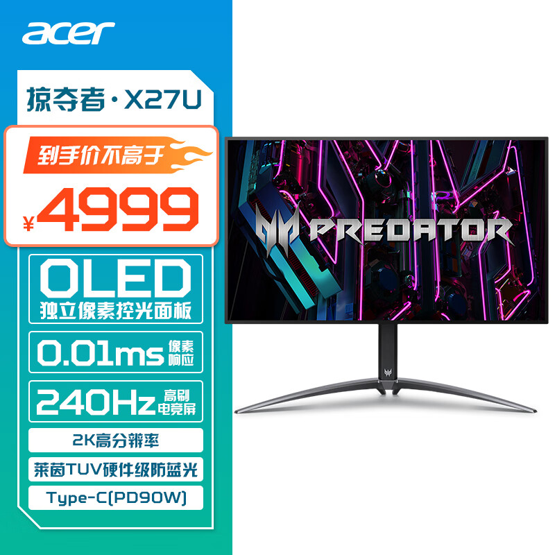 宏碁(Acer)掠夺者26.5英寸2K OLED屏幕240Hz刷新90Wtype-C+USB3.2电竞大金刚显示器(X27U)价格:5999.00元!