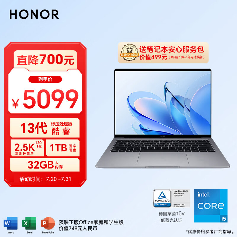荣耀MagicBook 14 2023 13代酷睿i5-13500H 32G 1TB 2.5K 120Hz高刷屏 14吋高性能轻薄笔记本电脑价格:5099.00元!