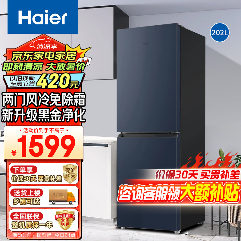 海尔(Haier)冰箱202升双门二门风冷无霜净味超薄小型家用电冰箱节能省电小冰箱价格:1599.00元!