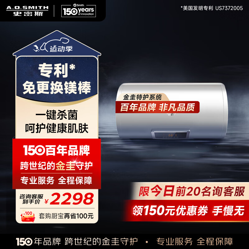 史密斯(A.O.SMITH)60升电热水器 专利免更换镁棒 金圭内胆 速热节能 纤美长款 大屏E60VC0 一级能效价格:2448.00元!