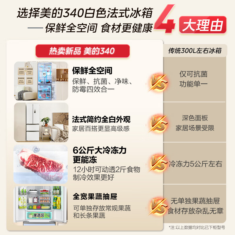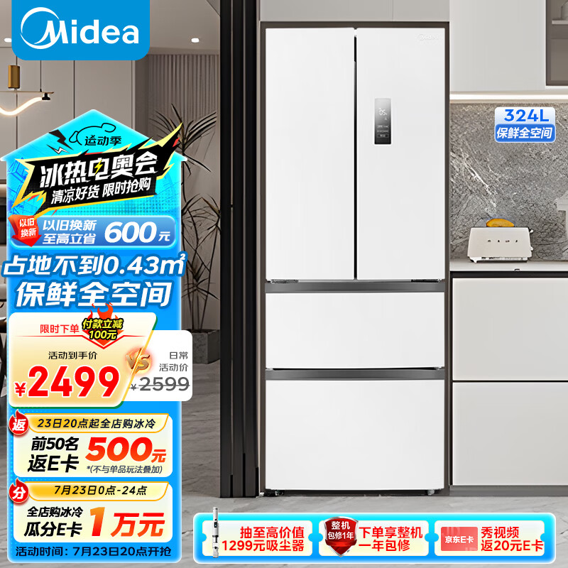 美的(Midea)340一级能效双变频法式多门四开门小型白色家用电冰箱超薄风冷无霜节能低噪MR-340WFPE价格:2599.00元!