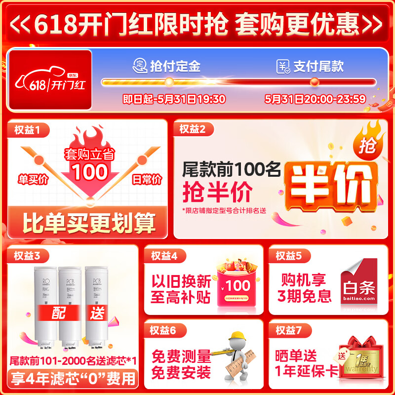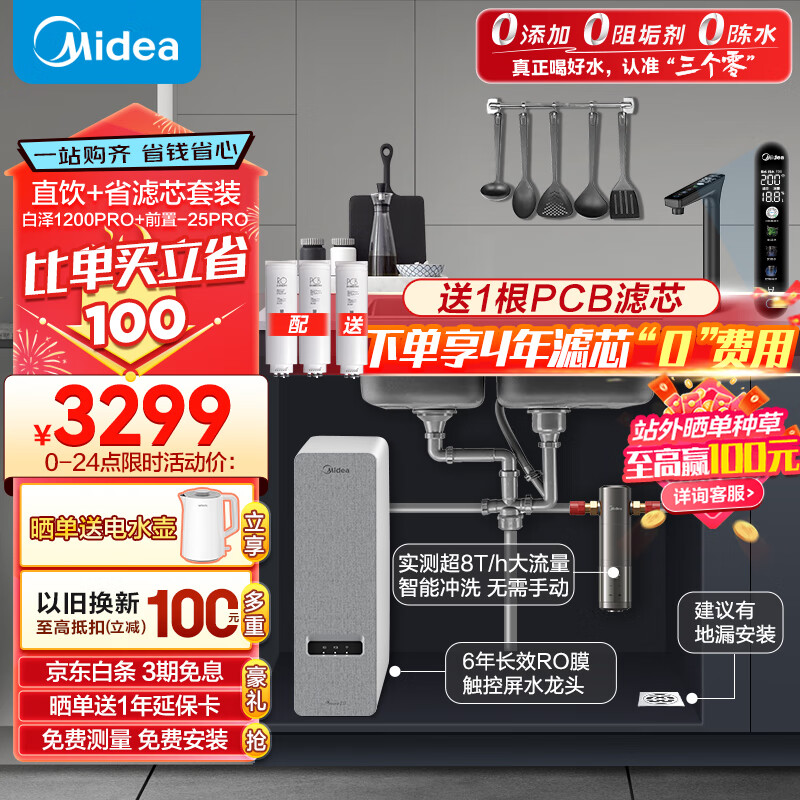 美的(Midea)省芯直饮净水器套装【白泽1200Gpro+前置过滤器-25pro】厨下式智能水龙头 RO反渗透家用一体净饮机价格:3299.00元!