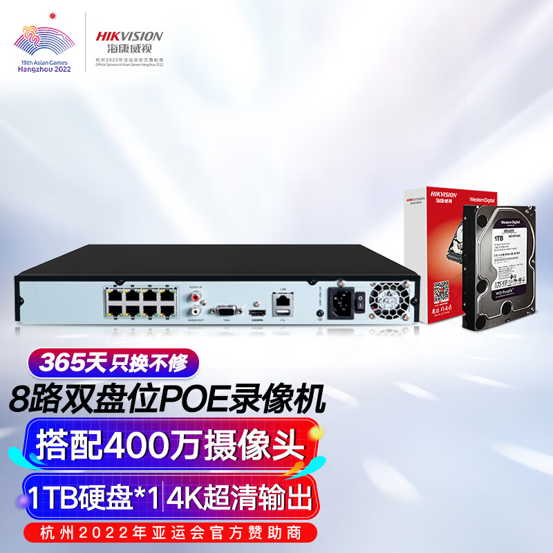 HIKVISION海康威视网络硬盘录像机监控8路POE网线供电NVR满配8个摄像头带1T硬盘DS-7808N-Q2/8P价格:1543.00元!