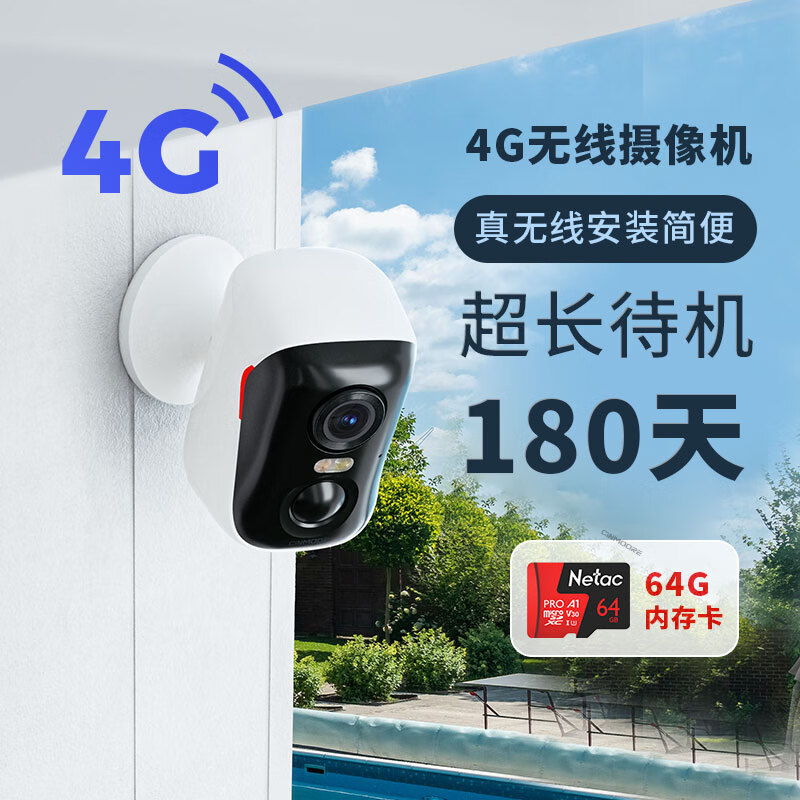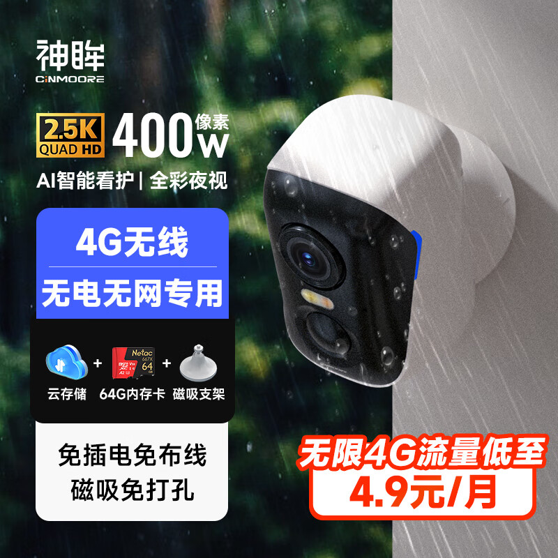 神眸4G监控摄像头 无网无电 2.5K400万极清 电池免插电免打孔 内置流量卡家用室内外高清夜视远程BC4价格:479.00元!