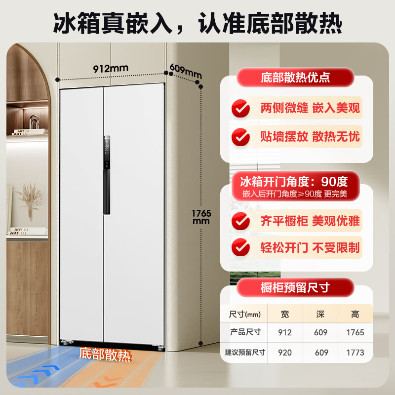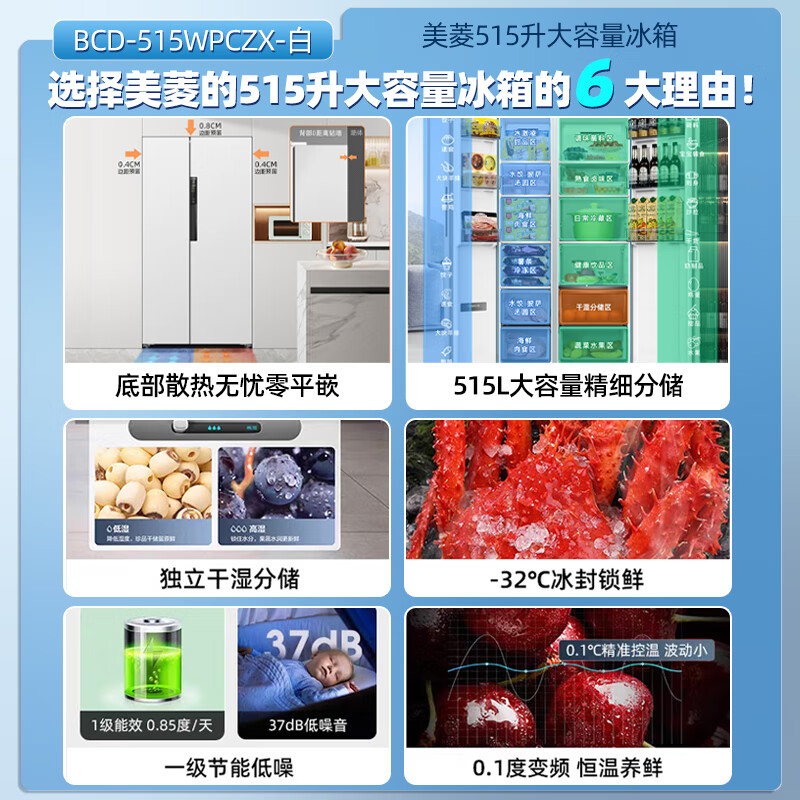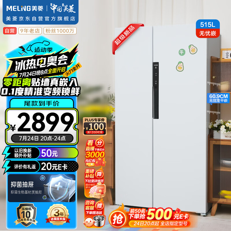 美菱(MeiLing)515升对开门双开门冰箱超薄零嵌底部散热变频一级能效节能家用风冷无霜净味BCD-515WPCZX大容量价格:3199.00元!