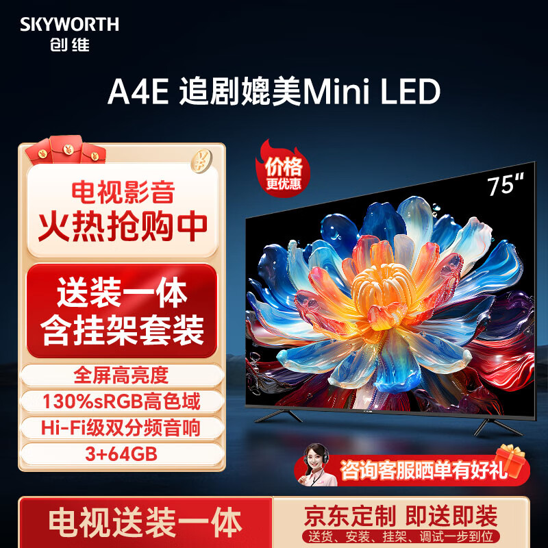 创维电视75A4E【送装一体版本】75英寸护眼电视机媲美mini led 双分频音响彩电液晶4K超薄游戏电视价格:3674.00元!
