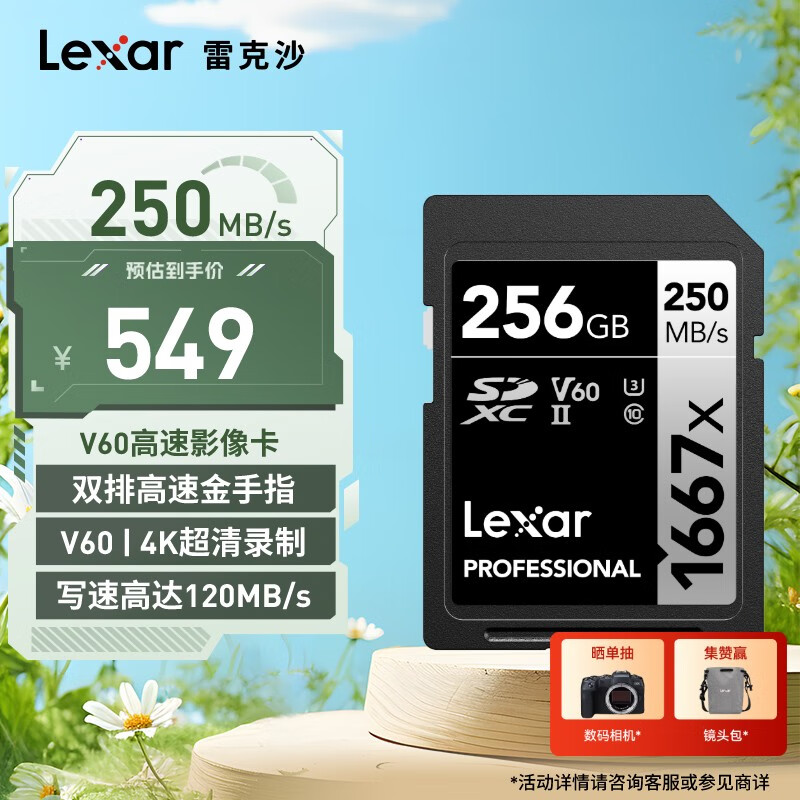 雷克沙(Lexar)256GB SD存储卡 U3 V60 4K数码相机内存卡 读250MB/s 写120MB/s 双排金手指(1667x Pro)价格:549.00元!
