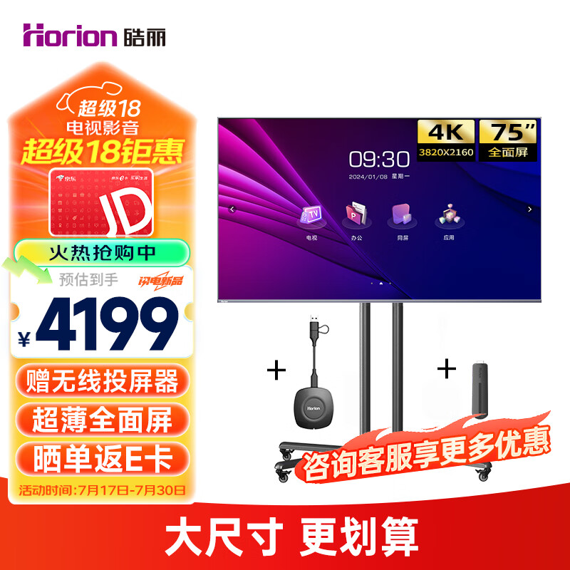 皓丽(Horion)75英寸智能会议电视4K平板电视超薄高清会议室显示屏商用智慧屏投屏移动教学大屏75H5标配价格:4199.00元!