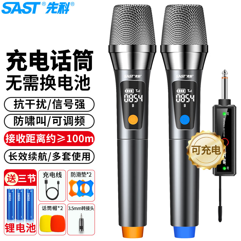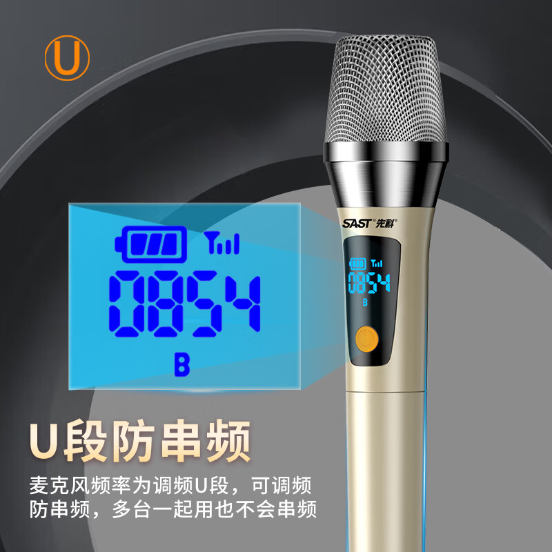 先科(SAST) OK-123充电无线麦克风U段家庭KTV唱歌舞台主持演讲K歌会议音箱音响功放调频一拖二金属话筒价格:399.00元!
