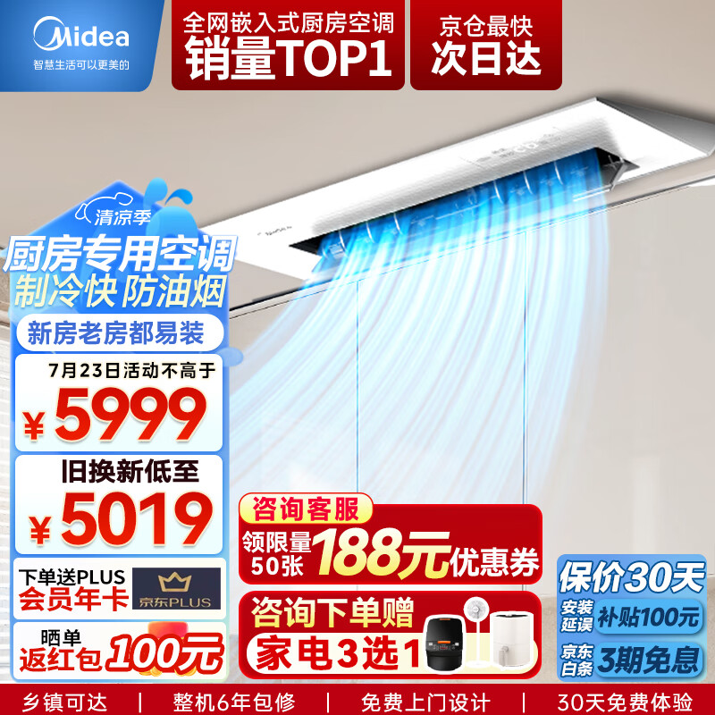 美的(Midea)小凉方 厨房空调 专用嵌入式 一级能效变频1.5匹 家用集成吊顶制冷CKF-35FW/BN1Y-FG100【极地白】价格:5999.00元!
