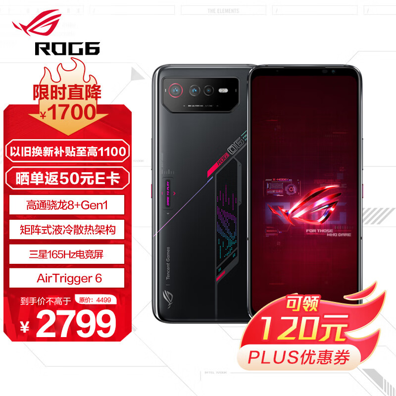 ROG游戏手机6 12GB+128GB 暗影黑 骁龙8+Gen1 矩阵式液冷散热6.0 165Hz三星电竞屏 2x3Plus肩键 5G ROG6价格:2799.00元!